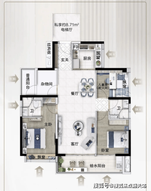 建面约126㎡户型,定位尊梯尊户·绝版断货王,目前热势上新,私享独立采光电梯厅,保障业主私密性与尊崇感,户型南北对流通透,打造4房设计,空间布局合理,动静分区清晰,客厅、卧室采光充足,兼顾居住舒适度与实用性,适合三口之家或四口之家居住,满足日常居住与休闲需求。