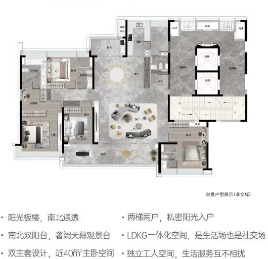 建面约205㎡奢适四房:中轴园林上,环幕景观楼王,双阳台设计,近9米宽巨幕阳台。