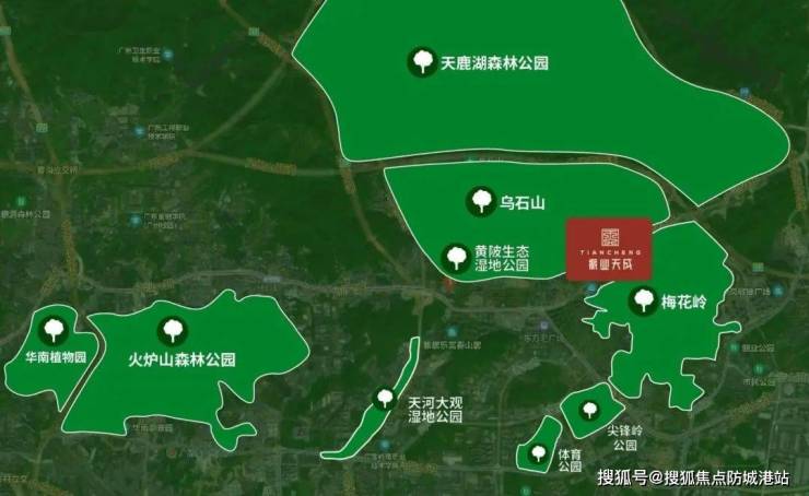 项目背靠乌石山,南望梅花岭,毗邻880公顷天鹿湖森林公园(广州市林业局数据),周边PM2.5年均浓度仅23μg/m³,负氧离子含量达市区的3倍,实测噪音分贝≤55dB(符合居住标准),获政府环境部门权威认证。