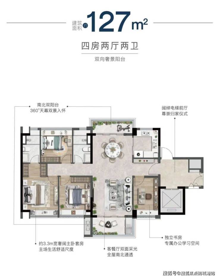 168㎡四房:两梯两户,双主套设计,电梯厅面积达15㎡,阳台长7米。