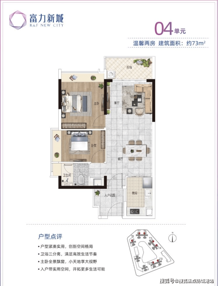 73㎡精致两房:总价225万起,适合年轻家庭或投资客,动静分区合理,得房率80%;