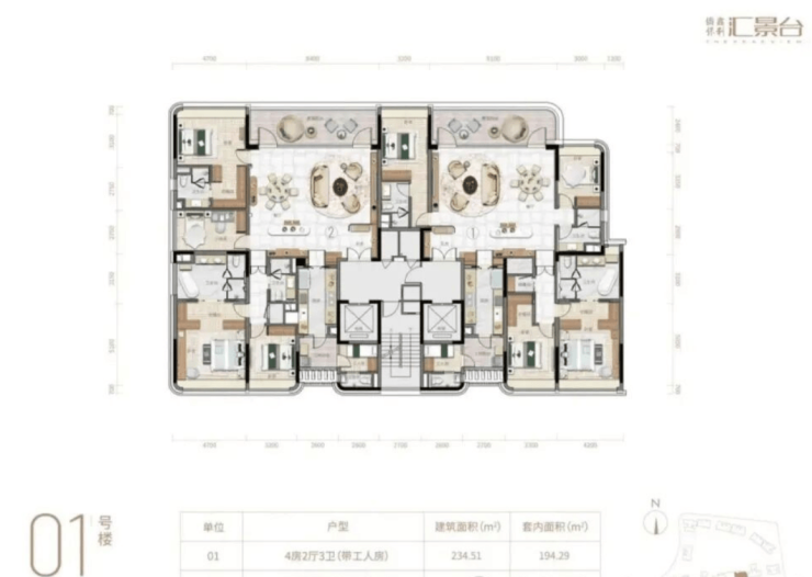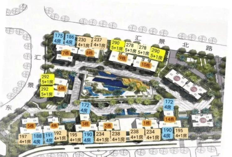 主力户型中,123-142㎡三房适合高端刚需家庭,2 梯 3 户或 2 梯 4 户的布局兼顾私密性与便利性,南向采光面宽,通风效果极佳;172-197㎡四房是改善主力,户型方正通透,动静分区合理,既能满足多孩家庭居住需求,也预留了独立办公或休闲空间;230-352㎡五房则是终极置业之选,2 梯 2 户纯板楼设计,私梯入户彰显尊贵,大尺度客厅与景观阳台相连,可俯瞰社区园林与汇景湖美景,部分 290㎡大平层更是做到了全明通透,细节处尽显豪宅质感。