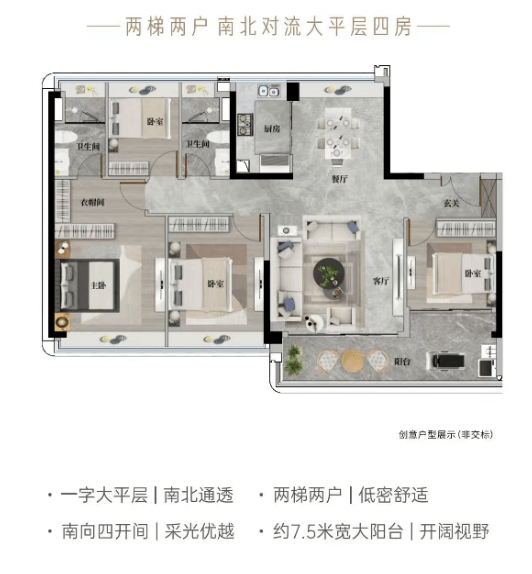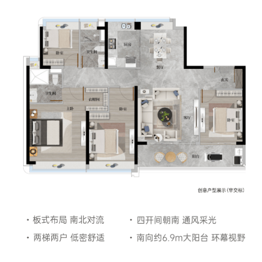 这是项目中最受欢迎的入门级改善户型。其中一款强调南北通透,阳光全天候洒入室内;另一款则坐拥双重景观——北瞰社区园林,南望校园绿地,搭配约7.5米宽景阳台,视野开阔,私密性佳。精装交付,省去装修烦恼,适合首次升级的家庭。