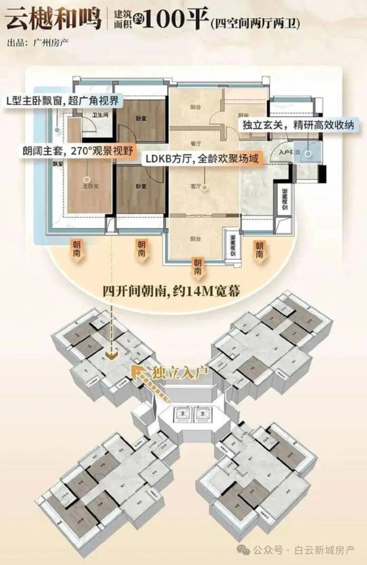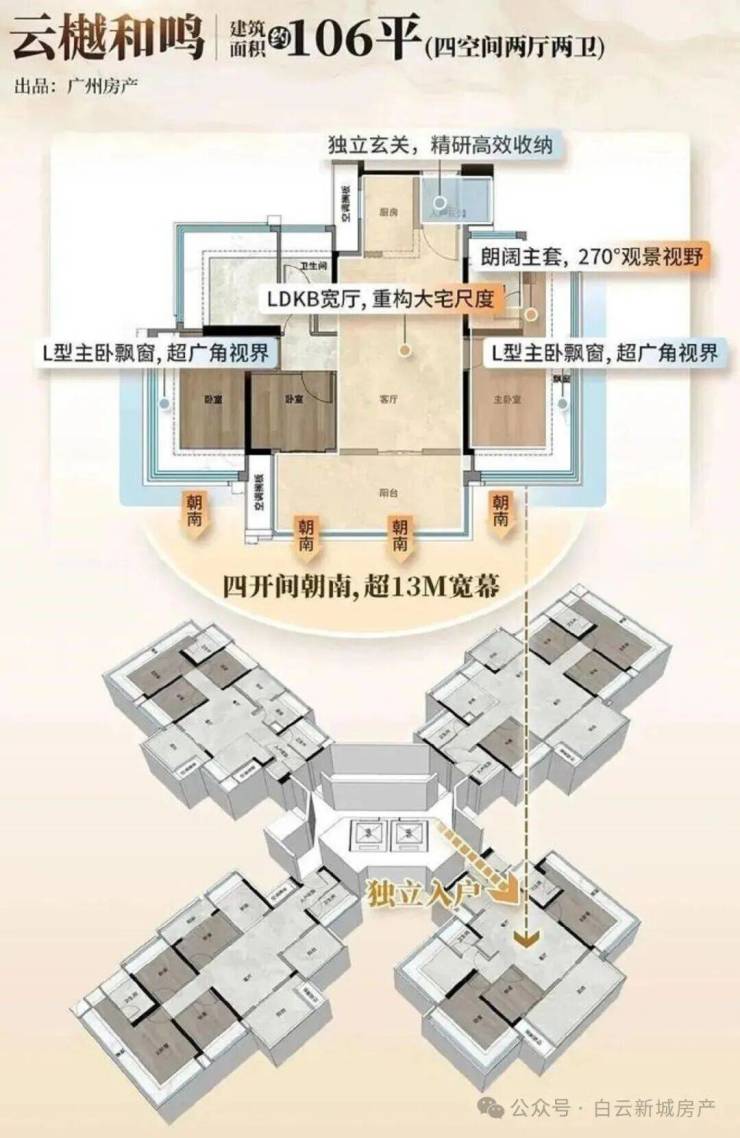 本次推出的“国贸·绿城云樾和鸣”地块,正是白云新城片区时隔四年后的首宗新宅地。这一时间节点的特殊意义不言而喻:它不仅意味着板块供应的重新启动,更预示着区域居住品质的全面升级。在过往的市场认知中,白云新城的高端住宅往往以大面积、高总价为主,对于改善型客户而言,选择面相对有限。而此次项目打破常规,推出建面约100-138平方米的四房户型,精准锁定了主流改善客群的需求痛点,让“白云新城”这一黄金地段变得更加亲民且可触及。