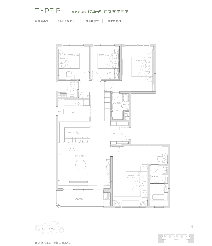 174㎡四房两厅三卫:270°环幕观景阳台,LDK一体化方厅,总价约2070万元起(认购9折后)。