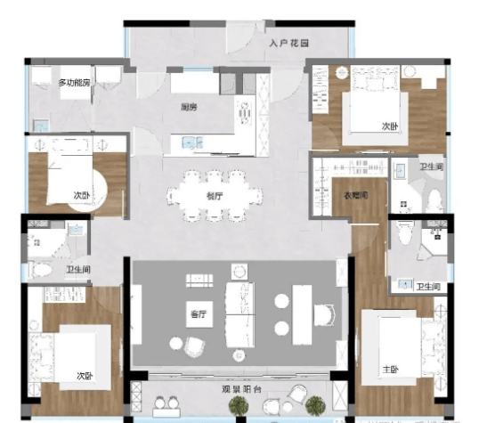 建面约161-171㎡五房两厅三卫(双套房,带入户花园):作为项目的改善型旗舰户型,该户型无需千万级预算即可享受城市珍稀江景景观。270度超广阔采光面,让室内每一个角落都能沐浴阳光与江风,双套房设计满足家庭成员的私密居住需求,入户花园、观景阳台等多重空间设计,兼具收纳、休闲与景观功能,适合追求高品质生活的改善型家庭,彰显圈层格调。