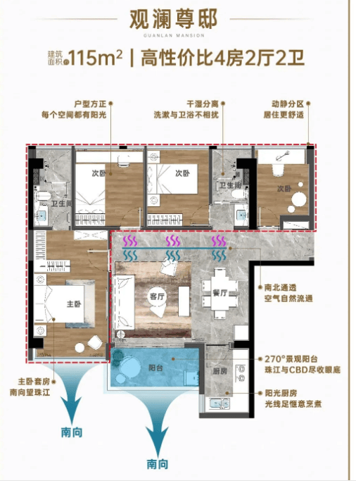 建面约110-115㎡南北对流四房两厅两卫:该户型主打南北对流设计,通风效果极佳,南望江景,北望山景,前后无遮挡,实现江景与山景双重享受,金融城、广州塔美景一览无余。横厅布局大幅拓宽采光面,让室内空间更显开阔通透,四房设计可满足多子女家庭或三代同堂居住需求,主卧配备独立卫生间,提升居住舒适度与私密性。