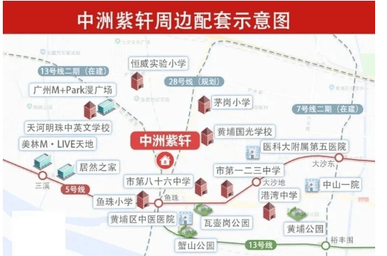 中洲紫轩周边生活配套成熟完善,5分钟即可畅享全优生活圈,医疗、商业等设施一应俱全,满足业主日常居住的各类需求。商业配套方面,项目周边汇聚天河美林天地、居然之家、宜家家居、山姆会员店等城市级大型商场,距离均在3公里范围内,驾车5-10分钟即可抵达,步行搭配地铁也可便捷通达。