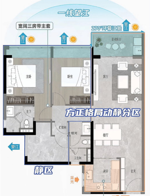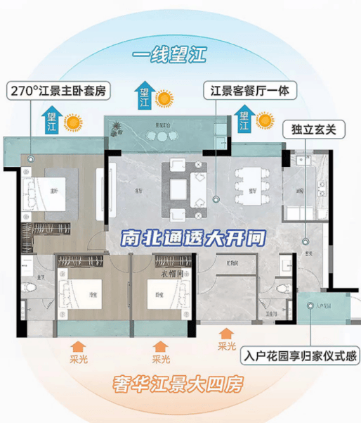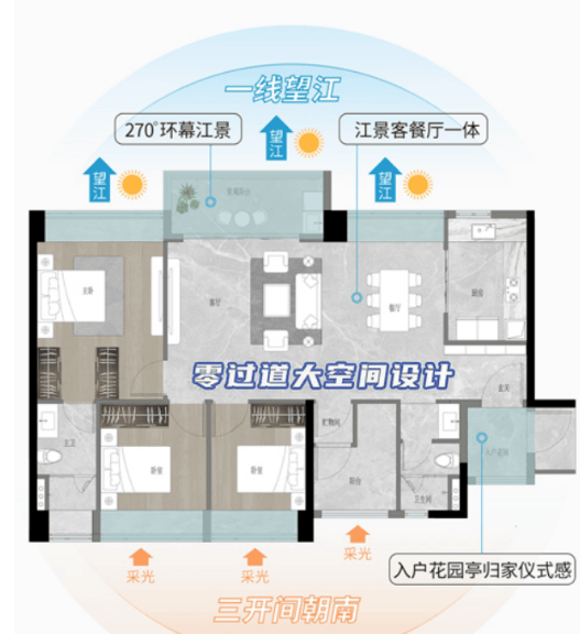 问:项目的江景视野怎么样?答:项目全楼栋一线望江,200米近江距离,片区唯一最宽600米阔景江面,看江户型比例高达约70%,江景视野极佳,无遮挡。