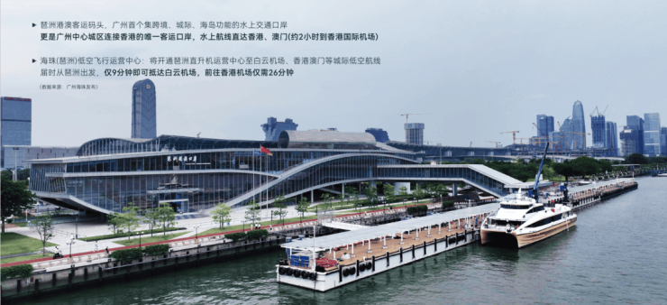 交通条件得天独厚,拥有最强双地铁配置,11 号线与 18 号线交汇,18 号线作为国内最快全地下市域快线,串联中山、珠海、澳门等湾区城市;11 号线是广州首条地铁环线,换乘站多达 26 座。项目 1 站可达琶洲,2 站到珠江新城,3 站至金融城。此外,海洲路无缝衔接湿地、琶洲与珠城,加上四纵三横核心主干道,无论是公共交通还是自驾出行,都能快速畅达全城。同时,琶洲港澳客运码头可水上直达香港、澳门,海珠(琶洲)低空飞行运营中心能快速抵达白云机场及香港机场,实现海陆空立体交通。