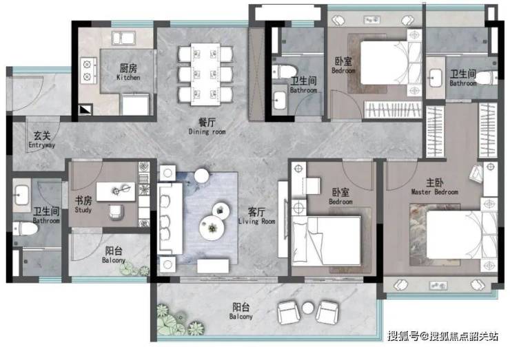 建面约140㎡四房:双套房设计,客餐厅连通7米阳台,可俯瞰园林景观;