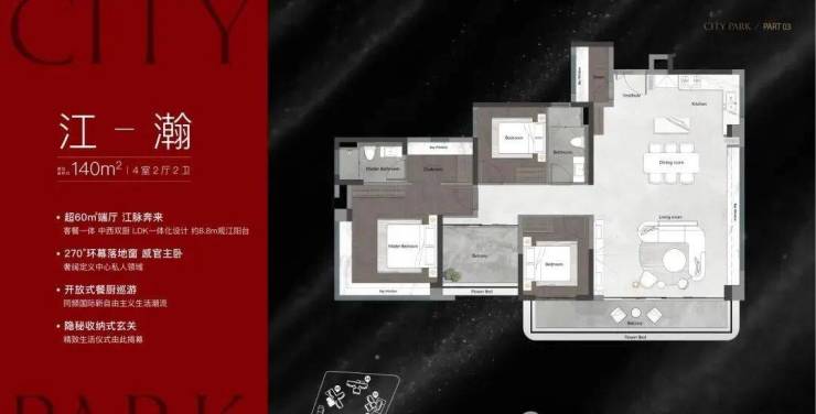 在售的120㎡和140㎡四房户型均为两梯三户设计,3、4栋高层可直观江景。户型在景观利用上很用心,超宽阳台能舒展观景视野,L型主卧转角飘窗让晨起就能望见江面,客厅预留的观景飘窗也进一步放大了采光与景致,空间利用率很高,没有明显浪费。