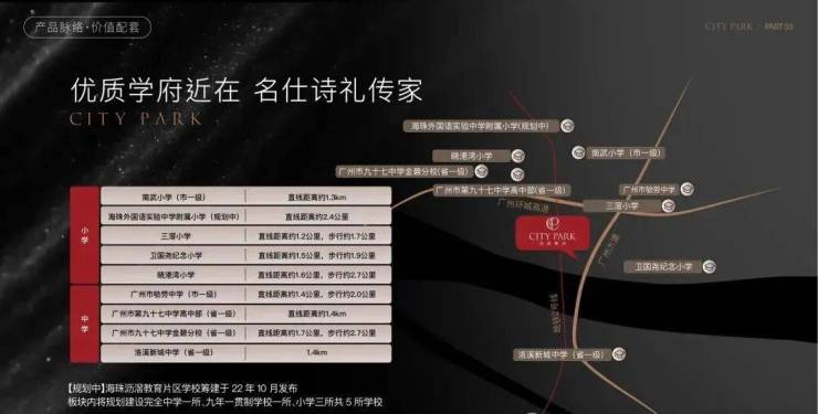 项目周边直线1.3公里内有市一级南武小学,1.4公里左右分布着省一级第九十七中学高中部和洛溪新城中学,市一级劬劳中学距离约1.5公里,从小学到高中的教育资源比较集中。具体入学资格需以当年教育局招生政策为准。