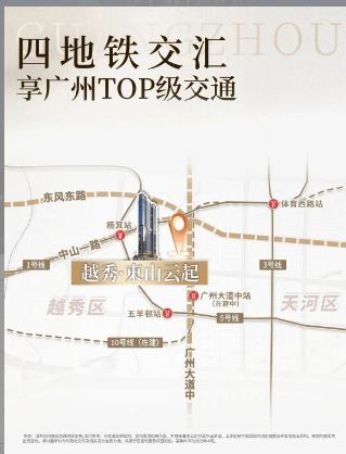 越秀·东山云起坐拥广州城芯立体交通网络,从道路交通、轨道交通、公共交通三大维度实现全城高效畅达,彻底解决城央出行拥堵难题。道路交通层面,项目依托广州大道中、中山一路、东风东路、黄埔大道构成四横主干路网,同时衔接内环路、广州大道北、农林下路、先烈南路形成四纵交通脉络,主干道路网均为城市核心交通要道,路面宽阔、通行效率高,可快速接驳天河、海珠、荔湾等核心区域,自驾出行全程高效便捷。轨道交通层面,项目周边覆盖多条广州地铁主干线路,临近地铁站点步行可达,通过地铁线路可直达珠江新城、体育西路、广州火车站等核心枢纽,实现轨道交通与城市商圈的无缝衔接。公共交通层面,周边多个公交站点密集布局,涵盖数十条公交线路,覆盖广州全城主要片区,满足不同出行需求。多维立体交通体系加持下,项目无论是日常通勤、商务出行还是休闲出游,均可实现快速通达,充分彰显城央核心住区的交通优势。