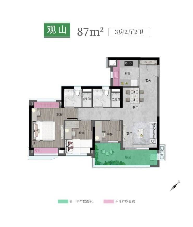 主力户型里,75㎡三房是科学城目前少见的小面积三房产品,四开间朝南,三个卧室全朝南,阳台约5.2米,南向展面超10米。86–88㎡三房两卫则主打通透,主卧带卫生间,阳台更大些。改善型选105㎡或138㎡,后者主套近25㎡,阳台6.1米,270°看山,视野确实舒服。