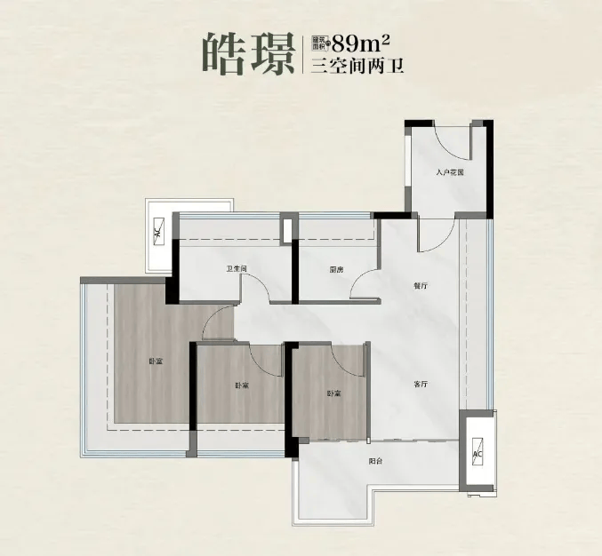 建面 89㎡三房两厅两卫,总价 238-250 万元,这个户型堪称年轻人的 “上车神器”,低总价门槛让刚需群体也能轻松负担。户型为东南朝向,采光充足,而且采用 L 型双开间阳台设计,这个阳台还能改造成约 4.4㎡的 + 1 房,不管是做茶室、书房还是储物间都非常实用,大大提升了空间利用率。玄关处还有独立收纳空间,就算是小户型也能告别杂乱,让家里时刻保持整洁,非常适合刚买房的年轻家庭。