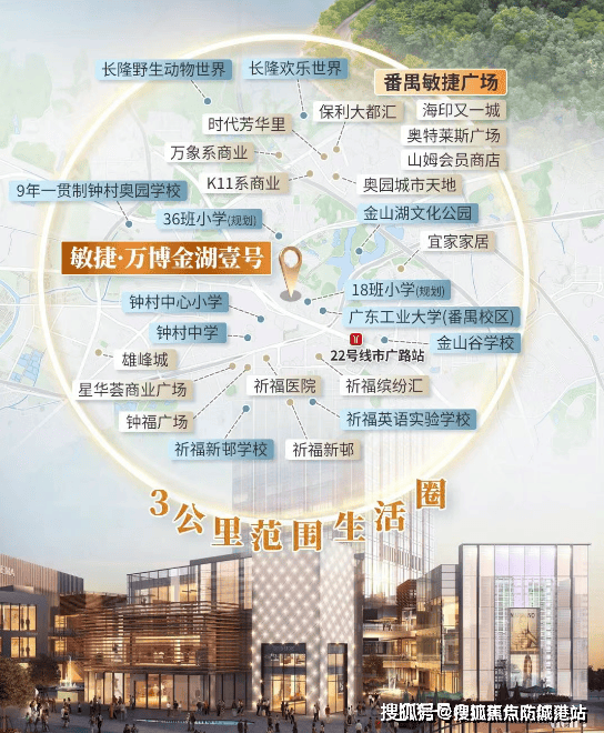 敏捷金湖壹号坐落于广州市番禺区市广路与金山大道交汇处,地处万博CBD核心区与金山湖文化公园生态带交汇点,占据“学铁商湖”全配套核心点位:
