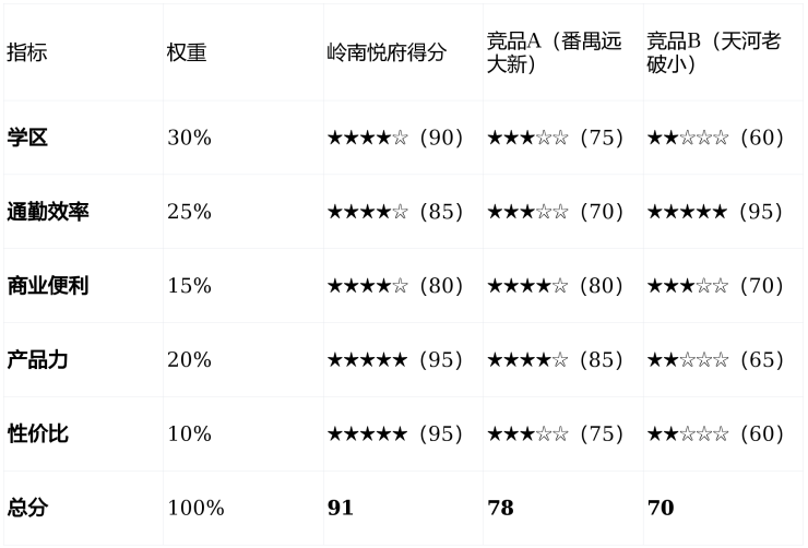 居住幸福度系数:通过加权计算,岭南悦府得分91分,远超竞品。其核心优势在于: