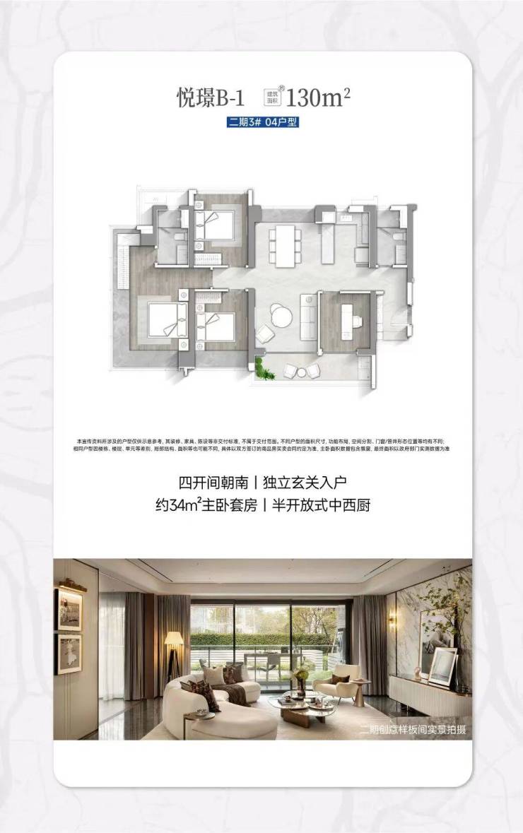 建面约130㎡的悦璟B-1户型,为4室2厅2卫设计,整体户型南北通透对流,做到了四开间朝南,拥有独立的玄关入户,保障了居住的私密性。主卧为豪华套房设计,整体建面约34㎡,配备了270°无界视野的观景飘窗,带来了沉浸式的观景体验,同时拥有独立的衣帽间与卫生间,给主人更尊崇的居住体验。
