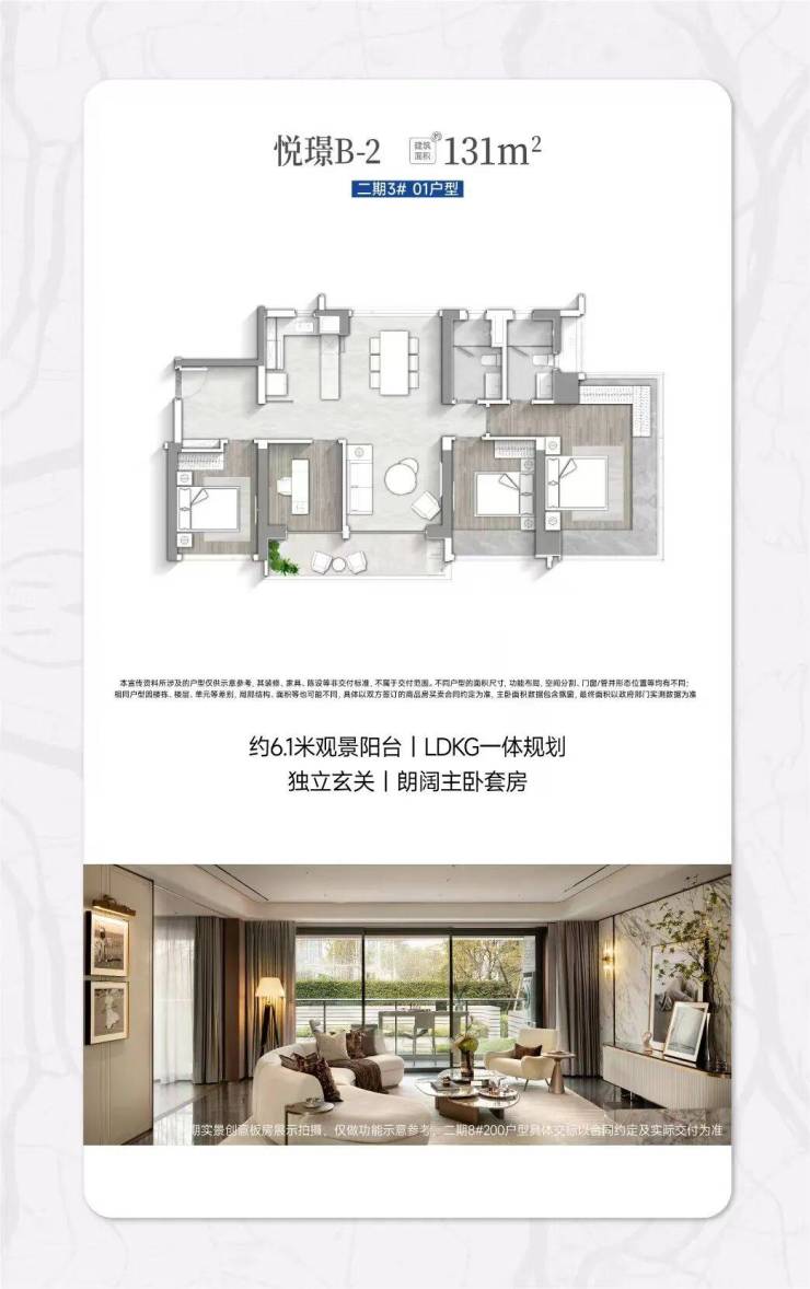 建面约131㎡的悦璟B-2户型,为4室2厅2卫设计,整体户型南北通透,拥有约6.1米的观景阳台,能够享受到充足的阳光与开阔的景观视野。户型采用LDKG一体化的空间规划,各个功能分区合理,生活动线自然流畅,日常居住的便利性很高。