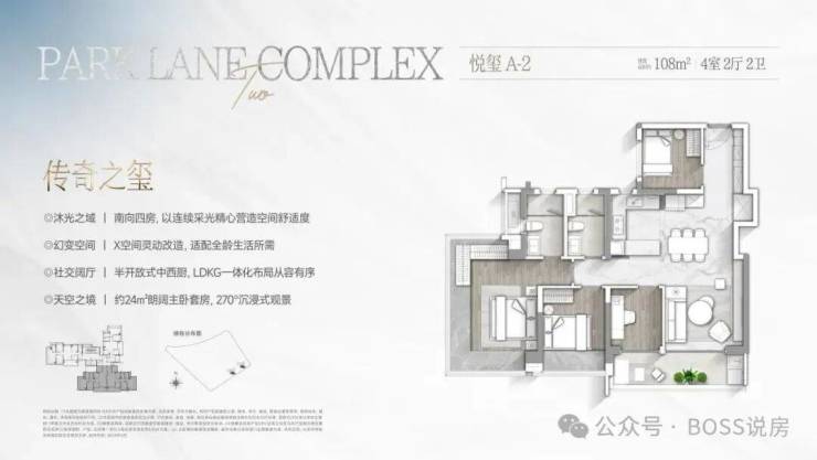 首先是建面约108㎡的悦玺A-2户型,为南向四房设计,整体户型以连续的采光面,精心营造了舒适的室内空间。户型内设置了灵动的X空间,可以根据家庭的需求进行灵活改造,无论是做成儿童房、书房、茶室,还是储物间,都能适配全龄段的生活需求。