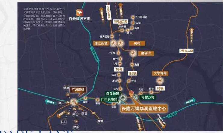 轨道交通方面,项目拥有多条地铁线路覆盖,能够快速通达广州各个核心区域。项目距离地铁3号线与7号线交汇的汉溪长隆站步行距离约500米,日常步行即可到达,无需借助其他交通工具;距离地铁7号线与18号线交汇的南村万博站约1.2公里,通过短途骑行或公交即可快速抵达。