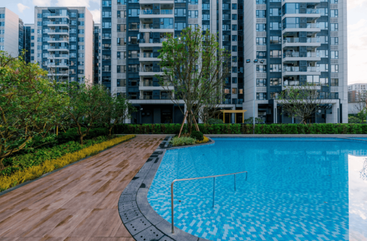 园林成型:约1.2万㎡的生态园林已基本完工,绿树成荫,花草繁茂,双泳池、儿童游乐区、慢跑道等设施一应俱全,随时可供业主体验。
