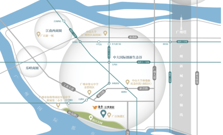 江湾潮起地处海珠后航道核心位置,紧邻珠江三江交汇,南向江景资源稀缺且优质。项目距离广州主要商业和办公区域仅15-20分钟车程,未来地铁10号线大干围站开通后,将进一步优化通勤效率。项目周边城市干道环绕,驾车可快速抵达琶洲、珠江新城及天河核心区。作为南洲板块首个高端滨江社区,江湾潮起兼具交通便利与景观优势,使业主在城市核心地段即可享受滨江生活的独特体验,兼顾居住舒适度与城市通达性。