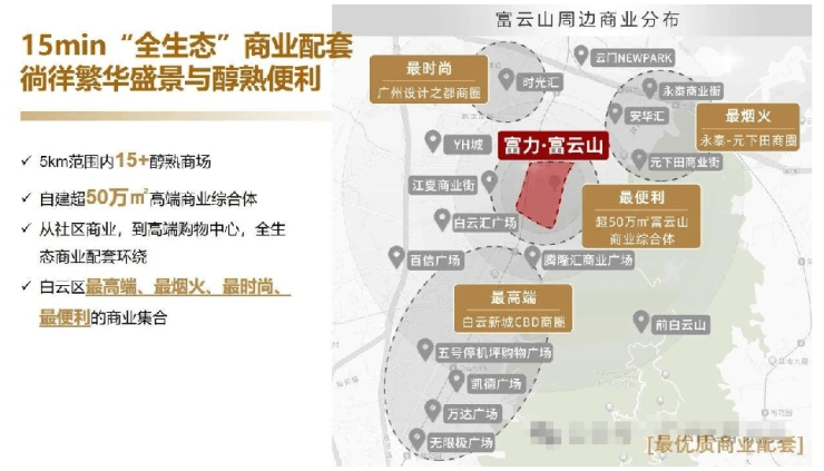 富力·富云山总建筑面积约为199.54万平方米,占地62.6万平方米,涵盖10大住宅组团、5大商业组团、2大教育组团及1所中央会所。绿化率为35%,车位比为1:1.2,物业管理费为4.59元/㎡。项目以无可撼动的地位构建了一个全新的奢华生活圈,包括顶级的住宅、超50万㎡的商业综合体、自建7所学校以及一座社区公园。