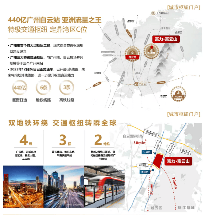 富力·富云山距离江夏地铁站-C口仅679米,距离地铁萧岗站不到1公里,周边3公里范围内拥有双地铁线路。广州白云站也仅3.5公里,通过便捷的主干道和高速公路网络,无论是市内通勤还是省际往来都非常方便。项目紧邻白云大道等主要交通动脉,出行极为便利。