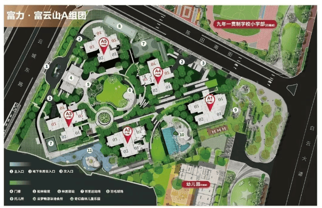 富力·富云山自建7所学校,涵盖了从幼儿园到中学的全年龄段教育需求。目前九年一贯制学校的小学部已落成,与A组团仅一路之隔。A区幼儿园已落成,九年一贯制学校的中学部也已全面封顶。未来,项目内的中小学资质预计将在执信或广外之间产生,确保孩子们能够享受到优质的教育资源。