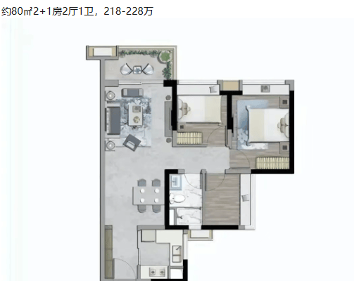 81㎡2+1房:紧凑实用,适合单身或小家庭,总价门槛低;