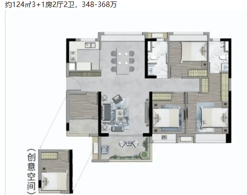 113–124㎡3+1房:四开间朝南,LDK一体化,部分单位设多功能X空间,可灵活改造为书房或儿童房。
