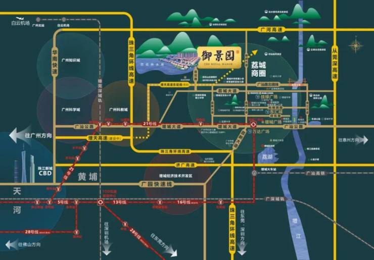 御湖山与增城市区仅有十分钟车程,交通便捷,四通八达。地铁方面,广州地铁21号线预计将在2018年底通车。全线开通后,项目业主可从增城广场直达广州天河。同时,广州地铁16号线也正在规划中,将与地铁21号线交汇于增城广场站。