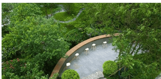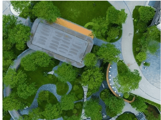 下层林荫步道系统:穿行于树影之间,结合弧形坡道与阶梯围合,形成极具包裹感的静谧空间,行走其间仿佛置身森林秘境。