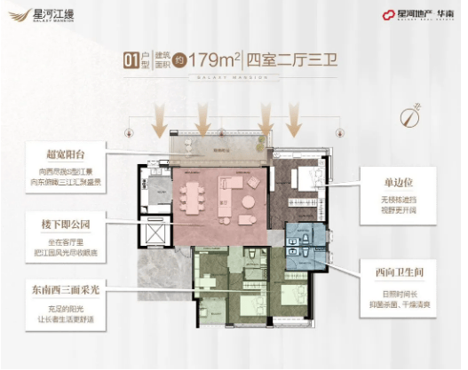 星河江缦在售户型均为大平层设计,主打179-235㎡四房户型,纯板式设计,专梯专户,双套房配置,整体户型方正、南北通透,采光通风俱佳,空间阔绰,适配高端改善、刚需改善等多种置业需求,圈层纯粹,彰显居住品味。