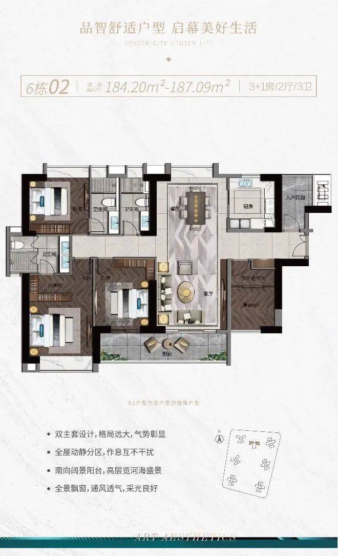 建面约180-193㎡精装四房两厅三卫:该户型为高端改善户型,梯户比3梯3户,得房率约85%,其中E6栋为项目楼王单位,获得建筑界“奥斯卡”的WELL健康体系金级预认证,装修标准达到行业顶级水平。户型采用双主套设计,两个主卧均配备独立衣帽间与卫生间,尊贵感十足;客厅开间达4.8米,空间阔绰,连接超大景观阳台,可远眺蕉门河水道出海口以及明珠湾未来繁华景观;书房空间独立,可打造私人办公区或藏书室;厨房采用中西双厨设计,满足不同烹饪需求,适配高端改善家庭或精英家庭居住。