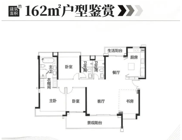 D1栋95–162㎡三至四房:定位高端改善,162㎡四房拥有超大横厅、双主卧套房、全景落地窗,层高达3.15米,楼板厚度140mm(远超常规100mm),卫生间结构板厚160mm,隔音降噪性能优异。