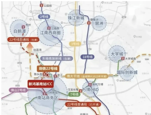 12条轨道交通交汇:包括4条高铁(京广、广深港、贵广、南广)、4条城际(广佛环线、穗莞深、广清、佛莞)、4条地铁(2号线、7号线、22号线、佛山2号线)。从广州南站出发,47分钟直达香港西九龙,17分钟抵达白鹅潭CBD,30分钟覆盖天河、琶洲、万博等核心板块。