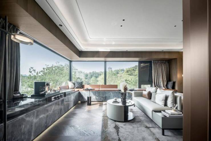 其占据孝德湖正面头排,穿过极具仪式感的双开门,迎面便是独特的玻璃对景玄关,“推门即景,开门见园”,每天回家迎接你的,是心旷神怡的一片湖光山色。