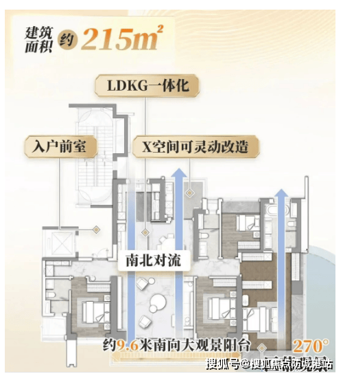 215㎡大平层,3 梯 3 户,带超大入户前室,拥有约 9.6 米南向大景观阳台,和主卧 270° 观景飘窗,可俯瞰园林景观,享受极致的视觉体验。建筑面积约 300㎡的户型,三梯两户,双套房设计,在家就能看到长隆,沉浸式感受乐园的欢乐。
