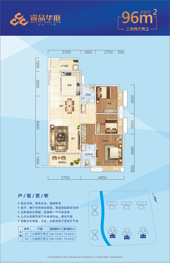 建面约84㎡~97㎡臻装美宅,户型实用,南北对流,户户均带入户花园,品质舒适。
