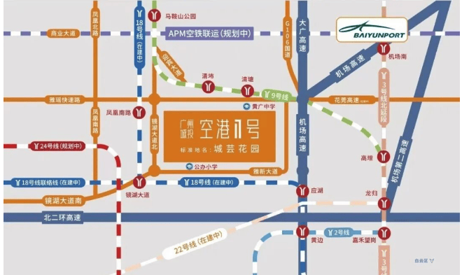 对于城市居民而言,便捷的交通条件至关重要。广州城投·空港1号距离地铁18号线凤凰南路站仅约1公里,轻松实现一站到达白云区的目标,快速连接广州北站及白云国际机场等重要交通枢纽。此外,通过雅瑶大道、镜湖大道、凤凰大道以及迎宾大道等主要道路,可以迅速接入机场高速、大广高速、广清高速和珠三角环线高速,极大地方便了自驾出行。