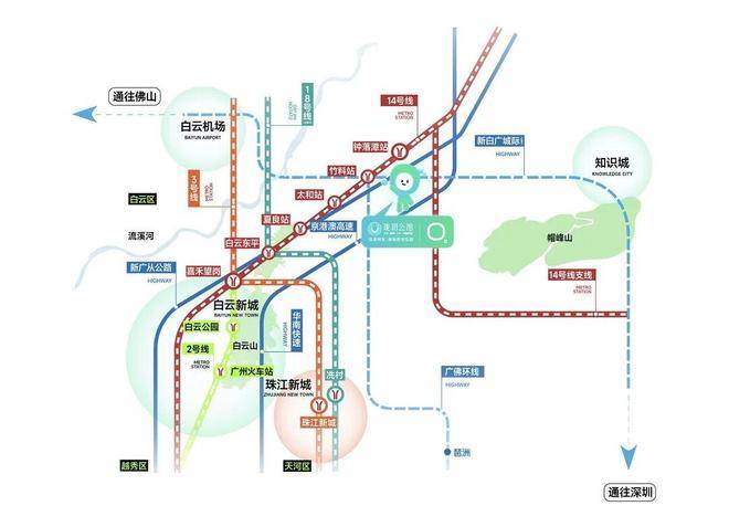 从城市交通逻辑来看,项目依托广州地铁14号线形成快速通勤通道。14号线属于广州北部交通骨干线路之一,采用高速快线运营模式,能够在较短时间内连接嘉禾望岗交通枢纽。嘉禾望岗站属于广州北部重要换乘核心,可快速接入地铁2号线、3号线系统,形成覆盖白云新城、天河中心商务区以及珠江新城商务区的通勤网络。对于在白云区及天河北部就业人群而言,该项目的交通结构属于典型的职住平衡型住宅解决方案。
