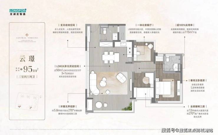 产品:全南向布局,超配空间设计,LDKGX一体化(客厅、餐厅、厨房、阳台、玄关、X空间无缝连接),95㎡户型餐客厅开间3.4米,139㎡户型阳台长8.4米。