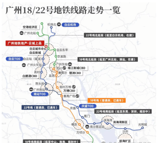 A4:地铁18号线、22号线白云城市中心站目前处于在建状态,具体通车时间以广州地铁官方公告为准,项目将同步跟进建设进度,及时向业主同步最新消息。