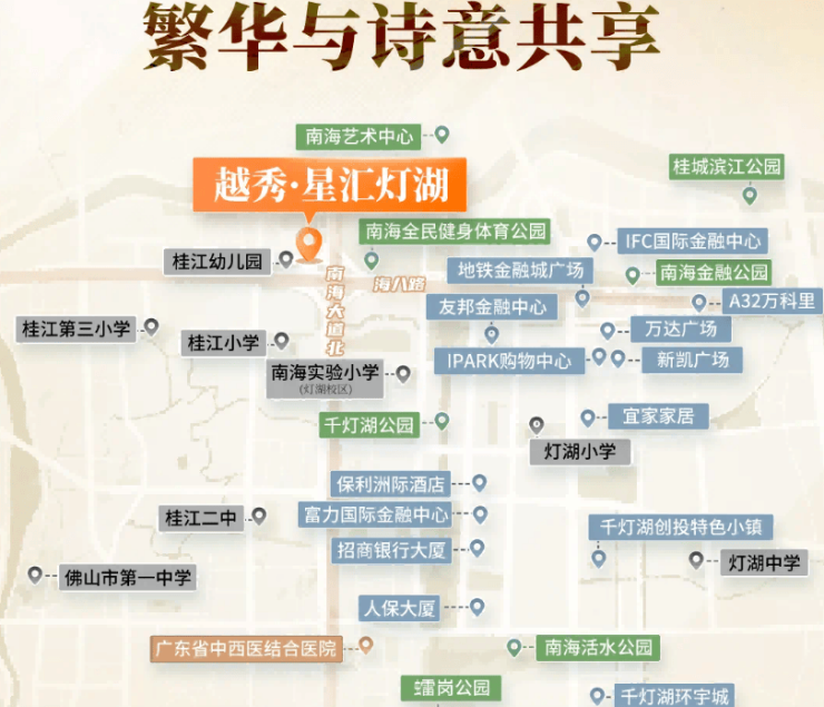 住在越秀星汇灯湖,最不愁的就是配套。项目位于佛山市南海区南海大道与海八西路辅路交叉口处,雄踞千灯湖 CBD 中轴核心板块,交通、教育、商业、医疗、休闲资源一应俱全。