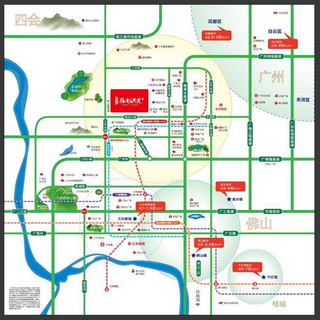 交通路网成熟高效。佛山地铁4号线(三水医院站)10分钟车程正在火热建设中,未来通勤效率会进一步提升。广佛肇城际轨道途径三水,三水北站、三水南站都在辐射范围内,高铁“吸虹效应”让项目快速融入湾区1小时生活圈。周边四横四纵高速格局已成型,南边大道、佛山一环、广佛肇高速、广三高速、沈海高速、广州绕城高速等动脉交织,5分钟上高速,日常出行油门一踩就能进主城。