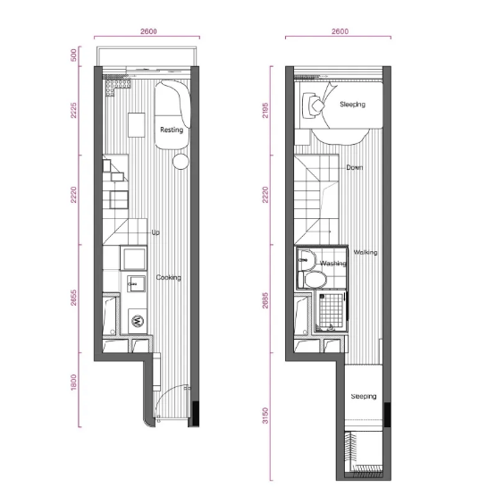 30㎡LOFT户型采用中置式入户通道,空间高效利用,卫生间干湿分区,功能井然有序,避免潮湿困扰,餐客厨一体化设计,流线布局更从容,上下层双客厅设计,生活各有天地,互不干扰,2+1房设计拥有更多可能性,可满足小家庭自住或办公需求。