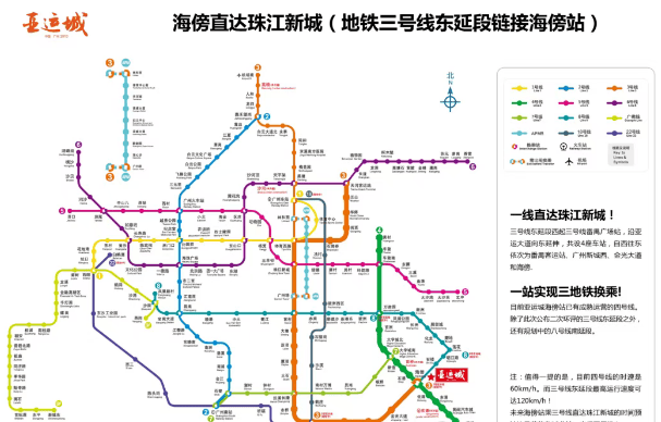 广州亚运城周边规划有三条地铁线交汇:3号线、4号线和8号线。其中4号线已经开通,最近的地铁站是海傍站,从这里出发6站可达琶洲,7站到天河。此外,3号线东延段也将进一步提升区域内的交通便捷性,方便居民直达珠江新城、南村万博CBD等地。